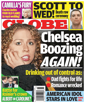 The cover of the latest issue of Globe featuring former first daughter Chelsea's shocked face as she may face a double loss. [Globe]