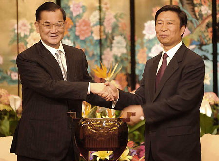 Taiwan opposition leader Lien Chan [L] shakes hands with Li Yuanchao, Party chief of Jiangsu Province, in provincial capital Nanjing April 26, 2005. [Xinhua]