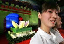 pose near the logo for the Beijing 2008 Olympics Volunteer Program at a