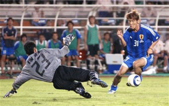 goalkeeper Kim Song Chol (23) before firing a second goal for Japan in
