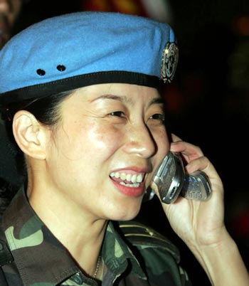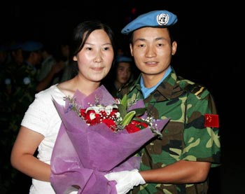 Chinese peacekeepers arrive at the Capital International Airport in Beijing July 11, 2005. They spent more than six months in Liberia, carrying out U.N. peacekeeping missions. [newsphoto]