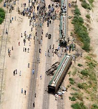 An aerial view shows derailed carriages after a train crash near Ghotki, 430 km (270 miles) northeast of Karachi, July 13, 2005. [Reuters]