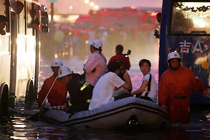 Chinese firefighters help to evacuate residents using a raft in a flooded