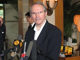Affairs Christopher Hill talks to the media after arriving in Beijing July