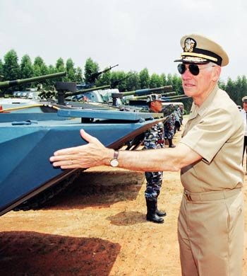 US Pacific Command chief William Fallon examines Chinese amphibian armored vehicles in Zhanjiang, South China's Guangdong Province September 10, 2005. Fallon is here, at the invitation of Guangzhou Military Area Command chief Liu Zhenwu, for his first China tour after assuming his current post. The trip also takes him to Beijing, Shanghai, Guangzhou and Hong Kong, Xinhua News Agency said. [newsphoto]