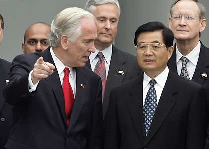 President Hu Jintao (L) looks over a hydrogen-powered car while visiting