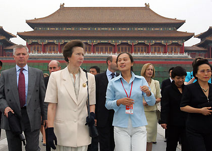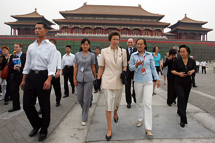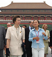 Britain's Princess Anne, escorted by a Chinese interpreter, visits the Forbidden City in Beijing September 20, 2005. Princess Anne is in China from September 20-24 to strengthen relationships between Beijing and London as they both prepare to host the Olympic Games in 2008 and 2012, and to see the work of Save the Children programme in China. [Reuters]