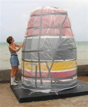 In this picture provided by the Florida Keys News Bureau, Carol Shaughnessy, inspects the Southernmost Point marker in Key West, Fla., Thursday, Oct. 20, 2005, after it was wrapped in plastic to protect it if Hurricane Wilma threatens Key West. One of the most photographed visitor icons in the Florida Keys, the marker was being painted and city public works' officials want to ensure the new paint remains intact. [AP]