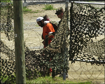 Guantanamo Bay, Cuba, is walked back to his caged cell from a