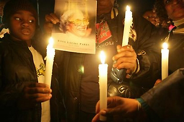 Dominic Nunn, 6, left, holds a lit candle while waiting for Rosa Parks' funeral procession to pass in Detroit on Wednesday, Nov. 2, 2005. [AP]