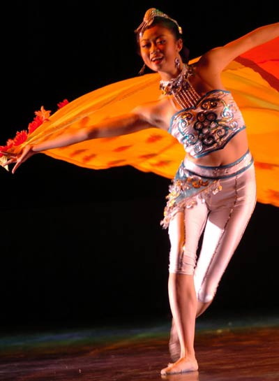 A Chinese dancer performs at a folk dance competition in Guiyang, Southwest China's Guizhou Province November 3, 2005. Sixteen delegations attend the event. [Xinhua]