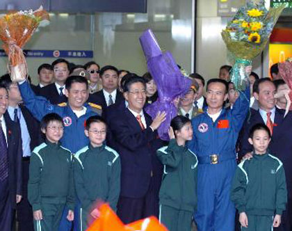 China's Shenzhou-6 manned space mission duo astronauts Fei Junlong (R) and Nie Haisheng (L) greet local welcoming citizens as they arrive in Hong Kong with leading engineers of the space expedition on November 27, 2005. [Xinhua]