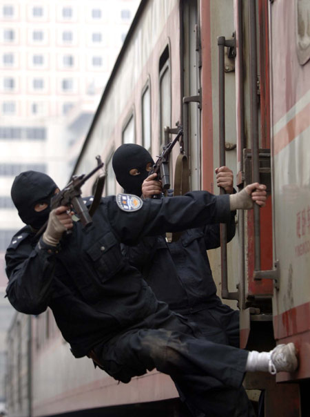 Chinese armed police officers take part in an anti-terror exercise on a railway line in Southwest China's municipality of Chongqing Tuesday January 10, 2006. China steps up railway security as the Spring Festival travel peak comes. [Xinhua]