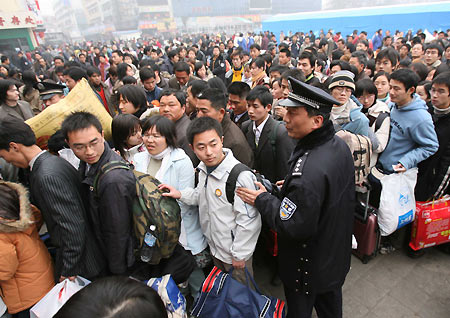 Students line up for checking outside Wuchang Railway Station in Wuhan, Hubei Province, January 13, 2005. [Xinhua]