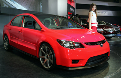 A model poses beside Honda's customized Civic Hybrid Modulo concept