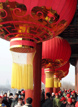 People pose for photos on Tian'an-men Tower in Beijing at the beginning of the Chinese Lunar New Year - the Spring Festival, January 31, 2006. Millions of visitors home and abroad visited Tian'an-men Square around the Spring Festival for the New Year celebration. [Xinhua]