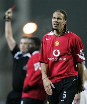Manchester United's Rio Ferdinand, right, is send off for a foul on Blackburn's Robbie Savage during their English Premier League soccer match at Ewood Park Stadium, Blackburn, England, Wednesday Feb. 1, 2006. [AP]