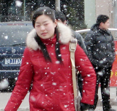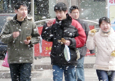 Several youngsters walks on the street of Lianyungang, a coastal city in east China's Jiangsu Province February 3, 2006. In the city, a strange weather happened: It was sunny and the sky was blue, but snowflakes fell down. This unusual weather brought surprise to the local residents and weather experts have not yet give an answer to this phenomenon. [newsphoto]