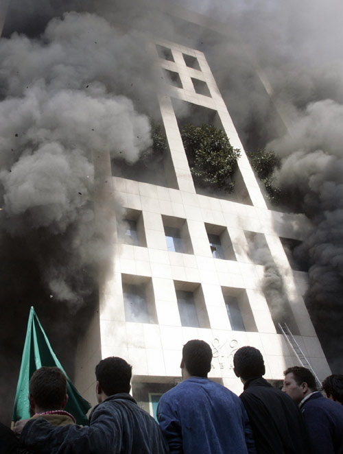 being set on fire by demonstrators in Beirut February 5, 2006. Angry