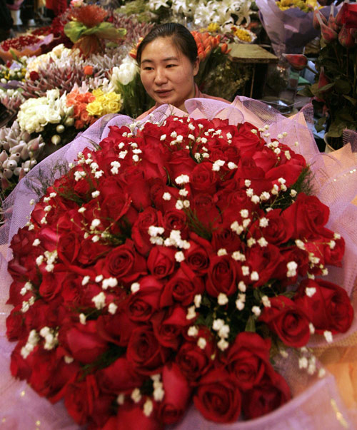 A Chinese vendor prepares a bouquet of red roses at a flower shop on the eve of Valentine's Day in Beijing February 13, 2006. [Reuters]