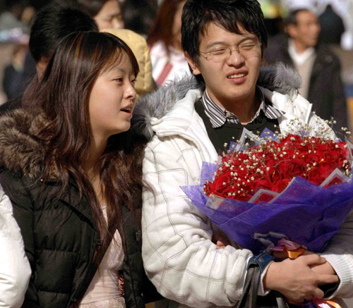 Chinese lovers walks in Wangfujing, Beijing February 14, 2006. [Xinhua]