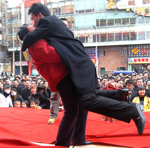 Two lovers kiss in a kissing contest on the Valentine's Day in Lanzhou, Northwest China's Gansu Province February 14, 2006. [newsphoto]