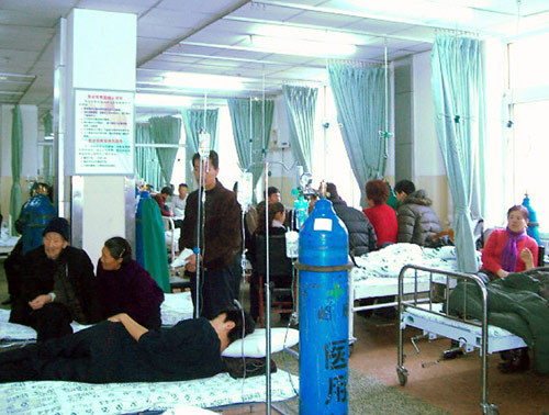 Patients receive treatment for carbon monoxide poisoning in a hospital in Yanbian, Northeast China's Jilin Province February 16, 2006. A large-scale carbon monoxide poisoning hit residents living in bungalows in the region, kiling 15 and hospitalizing 32 others, 8 of whom are in critical situations. Experts attributed the deaths and illnesses to unusually low atmospheric pressure and increased rain and humidity, which trapped carbon monoxide from burning coal close to the ground, the China Broadcasting Station reported. [Xinhua]