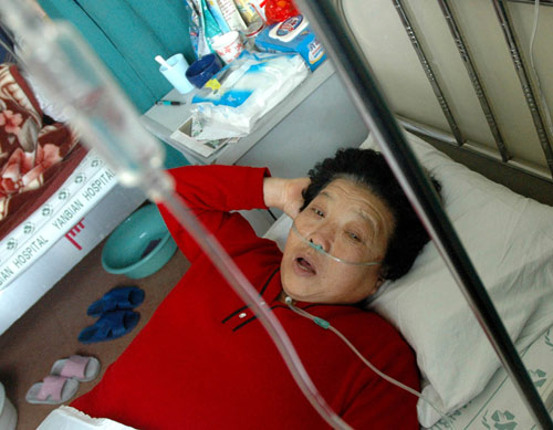 A woman receives treatment for carbon monoxide poisoning in a hospital in Yanbian, Northeast China's Jilin Province February 16, 2006. A large-scale carbon monoxide poisoning hit residents living in bungalows in the region, kiling 15 and hospitalizing 32 others, 8 of whom are in critical situations. Experts attributed the deaths and illnesses to unusually low atmospheric pressure and increased rain and humidity, which trapped carbon monoxide from burning coal close to the ground, the China Broadcasting Station reported. [Xinhua]