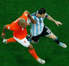 在巴西世界杯決賽中,阿根廷與德國(guó)兩隊(duì)的球員的“二人轉(zhuǎn)”式對(duì)決。