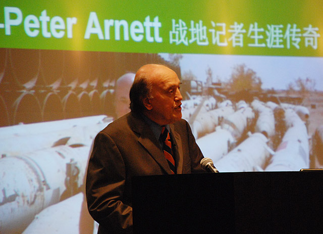 中國日報網環球在線消息:世界著名戰地記者Perer Arnett(彼得阿內特)2007年3月16日在汕頭大學科學報告廳開設了題為“美國媒體戰爭報道45年談得失”的講座。汕大學子都想一睹戰地記者的風彩,當晚科報廳全場滿座,門口被圍得水泄不通,很多同學直接坐在過道中。