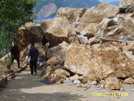地震造成北川山體崩塌 進入縣城的道路被大石截斷