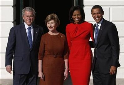 奧巴馬和布什都身著正裝,米歇爾和勞拉分別身著紅色和棕色連衣裙。相互寒暄之后,奧巴馬與布什走入橢圓形總統辦公室,在那里進行了將近兩個小時的私人會談,就國際、國內事務交換意見,主要內容是當前的經濟問題。兩位夫人則走進白宮“第一家庭”的官邸,由勞拉向米歇爾介紹房間環境,兩人還談到了撫養、教育子女的問題。