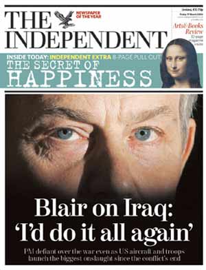 中國日報網(wǎng)站消息:英國《獨立報》3月17日頭條新聞:布萊爾無悔伊戰(zhàn)。