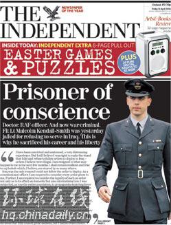 環球在線消息:英國《獨立報》4月14日頭條文章:良心的囚徒——英國皇家空軍醫生拒絕赴伊拉克服役被監禁。