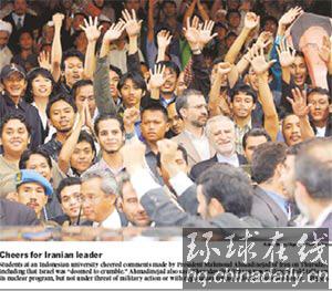 環球在線消息:《國際先驅論壇報》5月12日頭條照片:為伊朗領導人歡呼。圖為印尼大學生11日在聽取伊朗總統內賈德講話后為他歡呼。