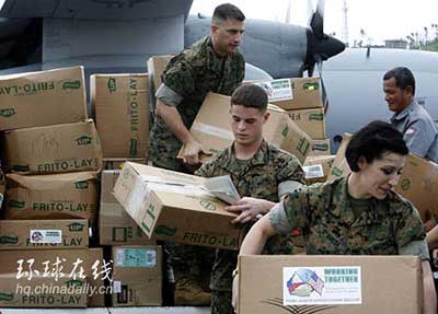 2007年1月,菲律賓遭受臺風“榴蓮”襲擊,美國海軍陸戰隊第三遠征旅士兵為菲律賓災民運送救援物品。