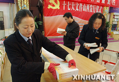 10月29日,工作人員把十七大學習資料擺上書架。當日,《十七大報告輔導讀本》等7部十七大相關圖書在山西省各地新華書店正式發行。 新華社記者 彭洋 攝