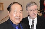 Li Zhengyun (R), the ninth generation of successors for silver-jeweleries-making from Miao ethnic group, instructs his son to make silver ornaments during the show of Guizhou National Folk Handicrafts in Beijing, capital of China, Nov 21, 2012.[Photo/Xinhua] |