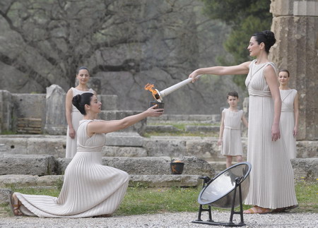 Greek actress Maria Nafpliotou (R, front), lights the Olympic flame for the 2008 Beijing Olympic Games at the site of ancient Olympia in Greece March 24, 2008. [Xinhua]