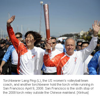 Norman Bellingham (R), chief Operating Officer of the United States Olympic Committee, gives the torch to torchbearer Lin Li at the McCovey Cove, the start of the Olympic torch relay in San Francisco, the United States, April 9, 2008. San Francisco is the sixth stop of the 2008 Beijing Olympic Games torch relay outside the Chinese mainland. [Xinhua]