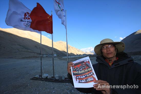 Zhang Hongjiang, a stringer for China Daily, poses for a photo with an issue of Olympian of April 30 in his hands at the Qomolangma Base Camp Wednesday April 30, 2008, 100 days before the opening of the 2008 Beijing Olympics. [Asianewsphoto]