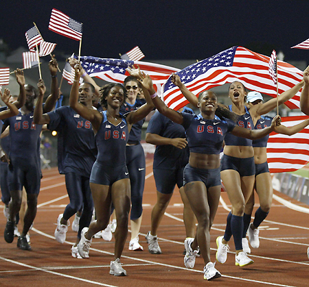 Members of the US Olympic Track and Field team, including sprinter Lauryn Williams, heptathlete Hyleas Fountain and shot putter Reese Hoffman, model the uniforms they will wear at the Beijing Olympics after they were unveiled at the US Olympic Track and Field Trials in Eugene, Oregon June 30, 2008. [Agencies]   Basketball Uniforms