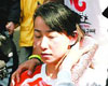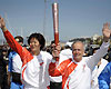 Jiang Xiaoyu (L) executive vice president of the Beijing Organizing Committee of Olympic Game, and an handler (R) holds the Olympic flame, shortly after arriving at San Francisco International airport, April 8, 2008. [Agencies]