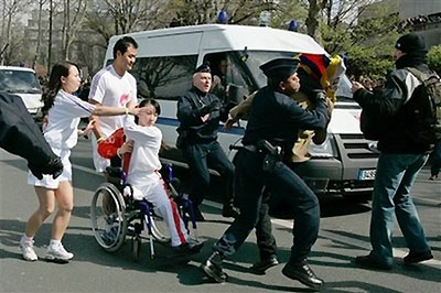 Torchbearer Jin Jing (in wheelchair), a Chinese Para-Olympic athlete, protects the torch to resist protestors' disruptions as she runs along the Seine River in the Beijing Olympic torch relay in Paris, April 7, 2008. [sohu.com]