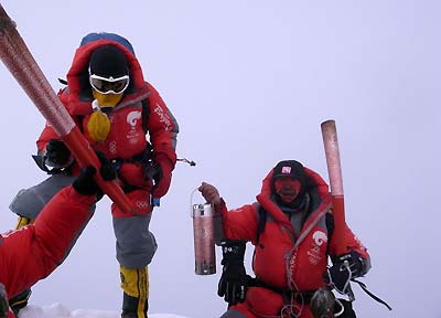 A torchbearer (R) holds the Beijing Olympic torch while carring a lantern encasing the Olympic flame before mounting the Mount Qomolangma in this May 8, 2008 file photo. [Xinhua]