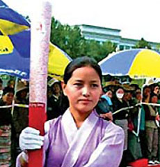 Dawa Yangzong holds a Beijing Olympic torch. [China Daily]