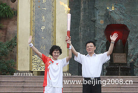First torchbearer Gao Min, who won gold medals in diving at the 1988 and 1992 games, holds the Beijing Olympic torch with Jiang Xiaoting, the Party chief of Leshan in Sichuan province, August 4, 2008. [Xinhua]