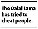 Updated: 2008-06-25 07:20 In his recent tour across the world, the Dalai Lama made lots of speeches on Tibet, insisting his words were in accordance with his deeds. But were his words really "deep from the heart" and "sincere" as he himself claimed? Let's take a look. First, the Dalai Lama reiterated that he met with many foreign politicians without any political intention, which could hardly be convincing. On April 21, the Dalai Lama thankfully sought help from the US Undersecretary of State Paula J. Dobriansky. He also appeared before a British parliament committee to "give evidence about human rights in Tibet". All the above proves what the Dalai Lama did was political. But why did he deny it? The answer is that in the past several decades he has tried to cheat people in the guise of a "spiritual or religious leader". However, his tricks don't always work.
