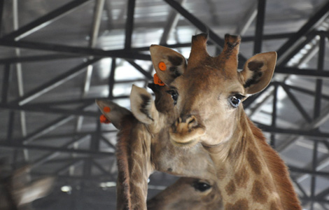 Newly arrived giraffes from South Africa have a cozy winter planned at Yunnan Wild Animal Park in Kunming, Southwest China’s Yunnan province, Nov 27, 2013. The average temperature of the house is maintained at 20 degrees Celsius. Twenty-three giraffes arrived at the park on Nov 26. [Photo by Hu Yongqi/chinadaily.com.cn] |