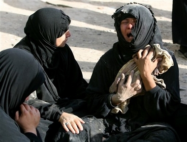 A mother clutches a t-shirt of one of 13 members of an Iraqi